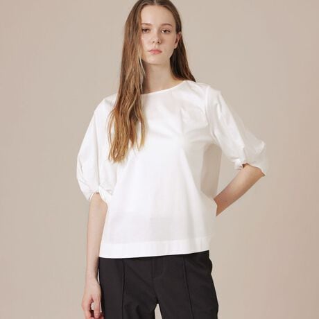 袖口にねじりを入れた立体的なボリュームスリーブがポイントのデザインTシャツです。ブラウスのようにも見える華やかな一枚で、気になる二の腕や肘をカバーする絶妙な袖丈もポイントです。