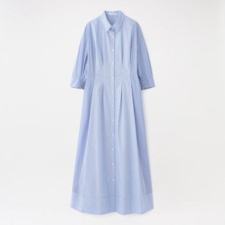 ワンピースの中心と外側で異なる細やかなストライプ柄を切り替えたブロッキングデザインが、クリーンな表情と程よい存在感を演出。