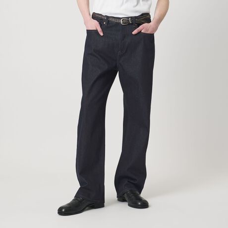 ※本製品はデニム地を織る際に付いた糊を残したままの未加工(糊付き、未洗い)のデニム製品です。そのため、着用を重ねることにより、自分流の色落ちをお楽しみいただけます。ただし未加工品のため、他の衣類、バッグ、ベルト、ソファーなどに色移りしますので、十分ご注意下さい。また、ご購入に際しては、洗濯後の「縮み」および「ねじれ」に留意した上、お求め下さい。