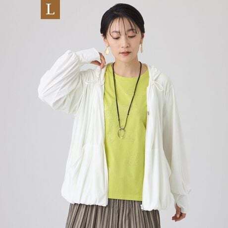 フード付きのラッシュガードパーカー。袖口は長めで、手先まで紫外線対策ができます。身頃にたっぷり入れたギャザーが大人っぽさを引き出し、お出かけ着にもできる仕上がりです。金属パーツやオリジナルロゴテープがさりげないポイントになり、1枚で着映えるデザインです。街着からレジャー、室内の冷房対策まで幅広く活躍します。
