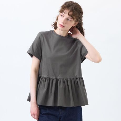 マットなブロード素材とキレイ目ジャージを組み合わせた異素材コンビがポイントのデザインTシャツ。