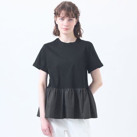 マットなブロード素材とキレイ目ジャージを組み合わせた異素材コンビがポイントのデザインTシャツ。