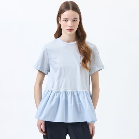 マットなブロード素材とキレイ目ジャージを組み合わせた異素材コンビがポイントのデザインTシャツ。