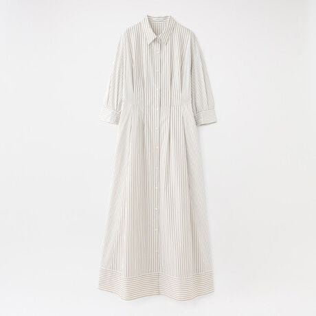 ワンピースの中心と外側で異なる細やかなストライプ柄を切り替えたブロッキングデザインが、クリーンな表情と程よい存在感を演出。