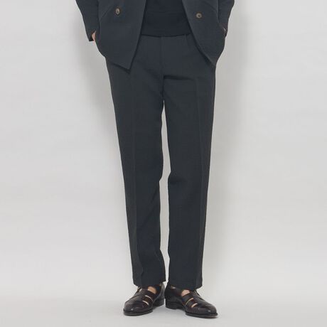 細番手の梳毛ウール糸を高密度に織り上げたウールサッカー素材。サッカー特有の波状の凹凸による軽やかなタッチと通気性に、梳毛ウールならではの上品な光沢感と滑らかな風合いを融合しています。見た目にも清涼感があり、肌離れが良く、春夏シーズンを快適に過ごせる素材です。ナチュラルストレッチ性を備え、軽さと上質感を兼ね備えたモダンファブリックに仕上げています。