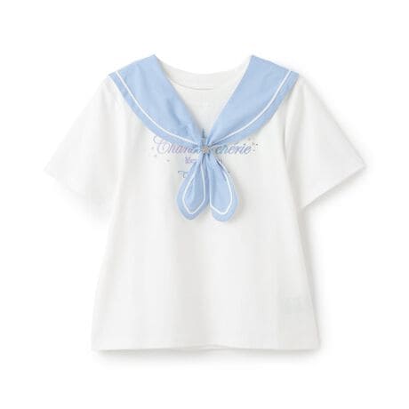 さわやかな雰囲気がただようマリンルックのTシャツです。セーラーカラーは表がラインデザイン、裏がレース生地のリバーシブルタイプ。つけ外しもできるため、その日の用途やコーデに合わせて印象を変えられます。触れた瞬間に冷たく感じる接触冷感の素材を使用。胸元で結んでいるスターモチーフつきのゴムは、ヘアアレンジに取り入れることも可能です。