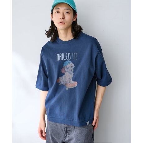 犬と猫をモチーフにしたグラフィックプリントが目を引くハーフスリーブTシャツです。