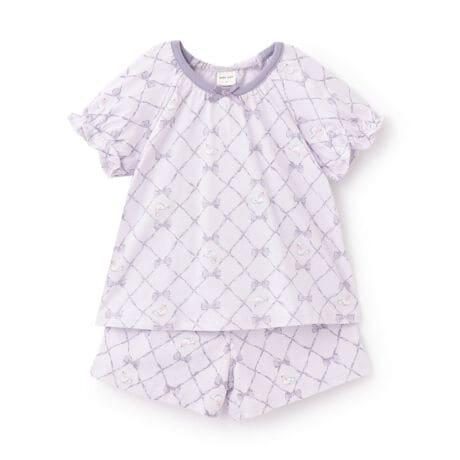 可愛らしいモチーフの総柄にミニリボンをあしらったパジャマです。お好みに合わせて選べる、テイストの異なる3パターン展開。本体にコットン素材を使用した、やわらかく肌当たりの良い着心地が魅力です。後ろ衿ぐりやパンツのウエストはゴム仕様になっており、お着替えをスムーズに行えます。内側にお名前を記入できるタグつき。