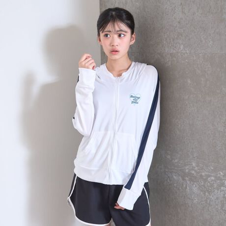 胸元のハートデザインが可愛いUVカット機能つきのラッシュガードです。
