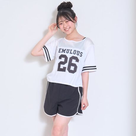 トップスのTシャツはメッシュ生地のナンバーデザインのアップリケがポイント。