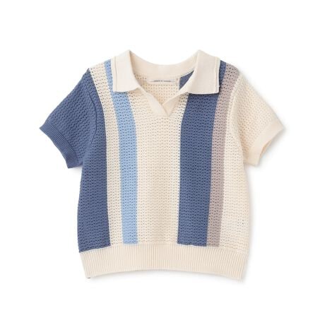 あたたかい季節に重宝する透かし編みのポロシャツです。大胆な配色の切り替えデザインがポイント。やわらかいコットン100%素材による、着心地の良さも魅力です。インナーにタンクトップを合わせた涼しげなスタイリングがおすすめ。内側にお名前を記入できるタグがついています。