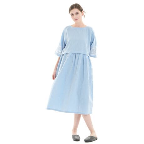 ボートネックですっきりとした印象に仕上げたルームワンピース。