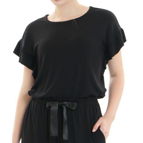 ドロップショルダーの半袖トップスに9分丈のパンツを合わせたシンプルなデザインのルームウェア。