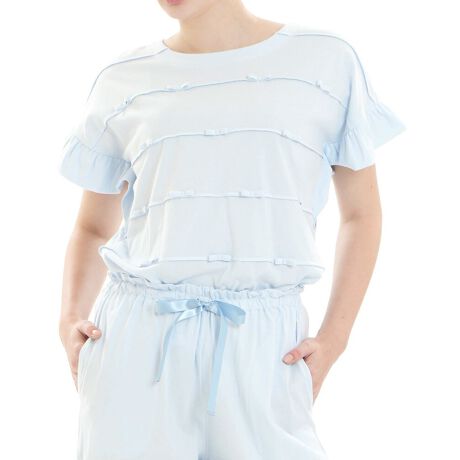 ドロップショルダーの袖口はフリルデザインに。気になる二の腕をカバーします。