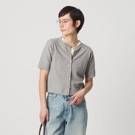 動きに合わせて細やかにきらめくラメ糸が、上品な表情を生む半袖カーディガン。