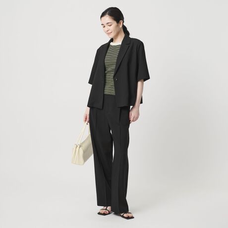 同素材でご用意しているパンツとセットアップでの着用はもちろん、Tシャツ×デニムとのカジュアルコーデもおすすめ。