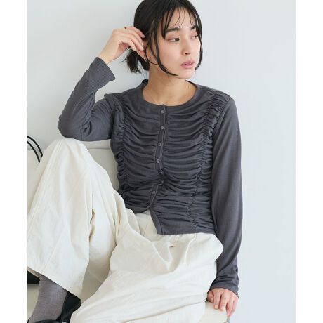 一枚で印象アップ、上品さをまとう全体に施されたシャーリングが、自然な動きと奥行きを演出するデザインです。シンプルな装いに取り入れるだけで、ぐっと洗練された雰囲気に導いてくれます。柔らかく伸びのある素材は、体に優しく寄り添い、リラックス感のある着心地です。前立てのボタンが縦のラインを強調し、すっきりとした印象をプラスします。インナーとしても羽織りとしても使いやすく、着回し力の高さも魅力です。きれいめからカジュアルまで幅広いスタイルに合わせやすく、日常使いはもちろんお出かけにも活躍します。着るだけでコーディネートが決まる頼れる存在です。透け感[ややあり]