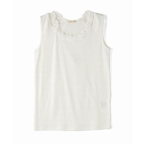 襟ぐりには繊細な花柄モチーフレースをあしらい、まるでネックレスのように首元を華やかに演出。
