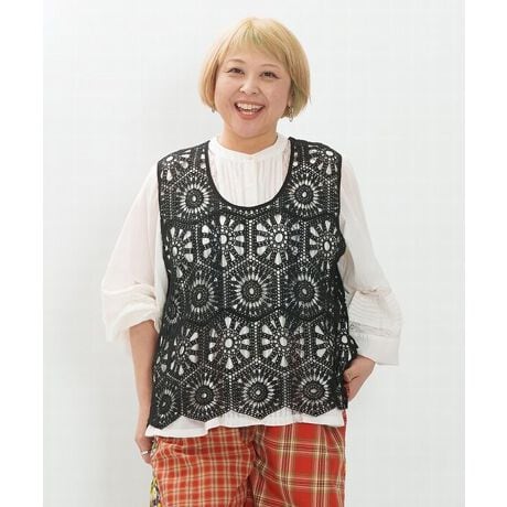 どこか懐かしくて、今っぽいカギ編み風の編地が目を引くベストが登場です。