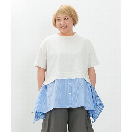 接触冷感機能付きのカットソーと布帛をドッキングした、重ね着風デザインのプルオーバー。
