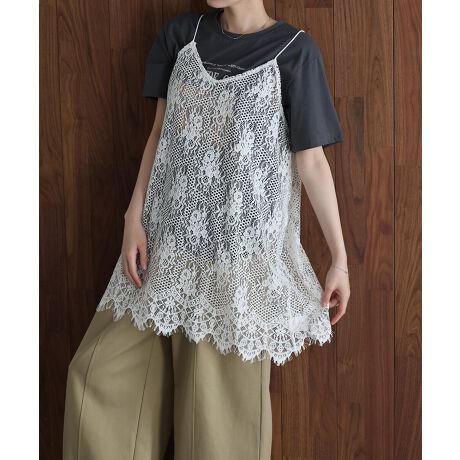 華やかで立体感のある総レースが目を惹くキャミソールトップス。