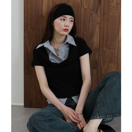 1枚で魅せる洗練レイヤード。ドレープネック×シャツのドッキングトップス