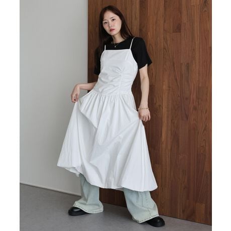 アシンメトリーギャザーが描く、モードなバルーンキャミワンピース