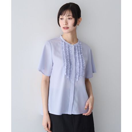 胸元のフリルデザインが顔周りを華やかに彩るブラウス。