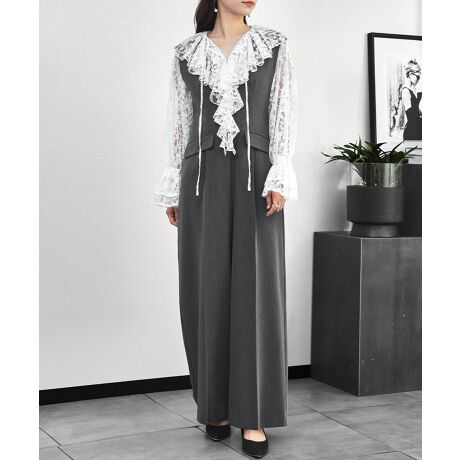 レースブラウスに、すっきりとしたオールインワンを重ねたレイヤードスタイルで企画しました。