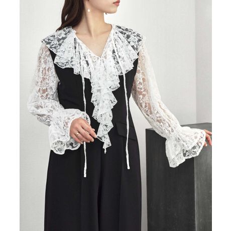 レースブラウスに、すっきりとしたオールインワンを重ねたレイヤードスタイルで企画しました。