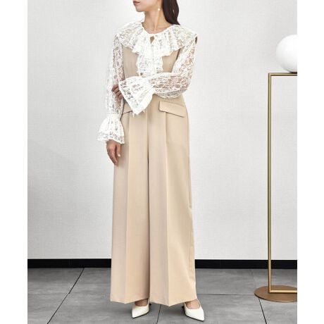 レースブラウスに、すっきりとしたオールインワンを重ねたレイヤードスタイルで企画しました。