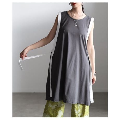 サイドにあしらったテープリボンが目を惹くノースリーブチュニック。途中までは縫い付け、途中から独立するデザインで動くたびに揺れ、軽やかな表情をプラスします。スポーティーさとモード感を絶妙にミックスした一枚です!