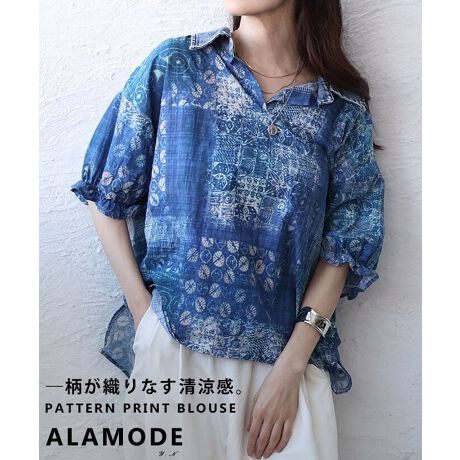 【ブラウス】 レディース トップス 半袖 五分袖 総柄 パターンプリント デニム襟 切替デザイン