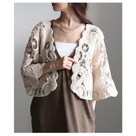 クロシェ編みが目を惹くショートカーディガン。コーデのアクセントとして取り入れるだけで、ぐっと華やかな印象に。ショート丈でスタイルアップも叶い、夏の二の腕カバーにも頼れる一枚です☆