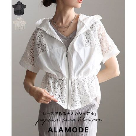 レース切り替えがさりげなく映えるフード付きライトアウター。ショート丈でバランスが取りやすく、ウエストのドロストでシルエット調整も可能。軽く羽織るだけでこなれた印象に仕上がる一着です☆
