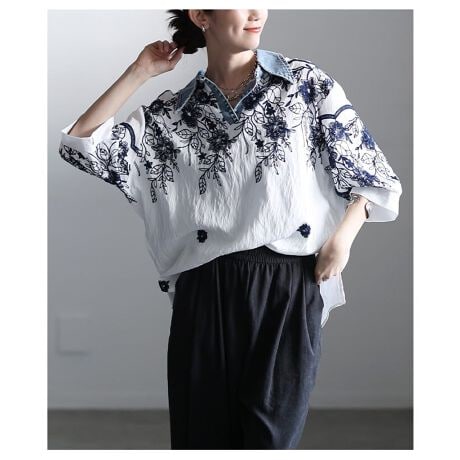 花刺繍がやさしく映えるスキッパーシャツ。襟にデニム生地をあしらうことで、ほどよいカジュアル感をプラスしています。抜け感のある首元で、さらっと着るだけでこなれた印象に仕上がる一枚です☆