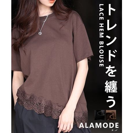 裾にレースをあしらった、今季トレンド感たっぷりのカットソー。斜めカットのデザインでお腹からお尻までさりげなくカバーしてくれます。一枚で着ても、レイヤードしても楽しめる着回し力の高い一枚です☆