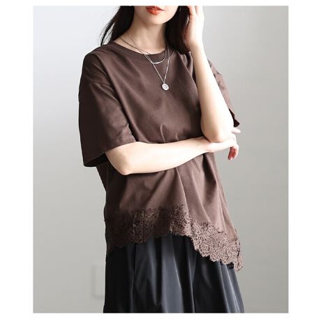 裾にレースをあしらった、今季トレンド感たっぷりのカットソー。斜めカットのデザインでお腹からお尻までさりげなくカバーしてくれます。一枚で着ても、レイヤードしても楽しめる着回し力の高い一枚です☆