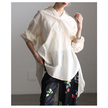 フラワー刺繍が華やかに映えるスキッパーチュニック。首元の抜け感がすっきりとした印象を与え、さらっと着るだけでコーデに軽やかさをプラス。大人のリラックススタイルにぴったりな一枚です☆