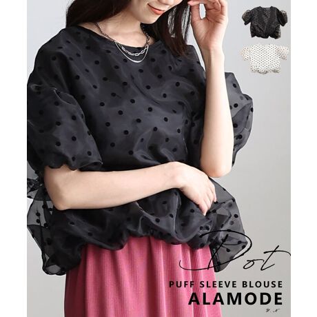 ドット柄のオーガンジーが軽やかに映えるパフスリーブブラウス。ふんわりとした袖と裾のバルーンシルエットで、やわらかな立体感を演出します。透け感のある素材で抜けも生まれ、着るだけで華やぐ一枚です☆