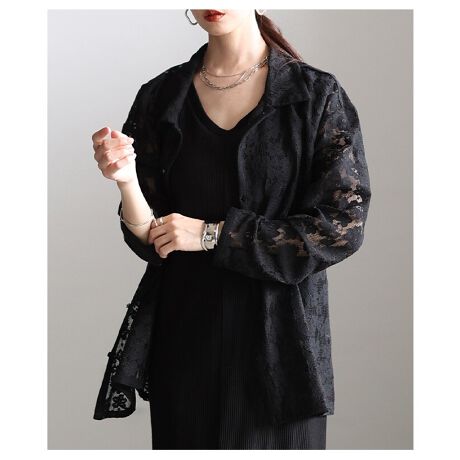 繊細な総レースが目を惹く開襟シャツ。ほどよい抜け感のあるデザインで、大人の着こなしに軽やかさをプラスします。長め丈で気になる腰まわりもさりげなくカバーできるのが嬉しいポイントです☆