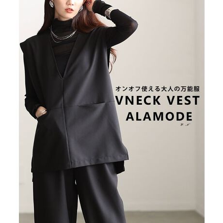 深めのVネックが顔まわりをすっきり見せてくれるベスト。コンパクトなシルエットでバランスが取りやすく、重ねるだけでコーデが引き締まります。着回し力が高く、幅広いスタイルに活躍する一枚です☆「almam-0615」のパンツとセット可能アイテムです。