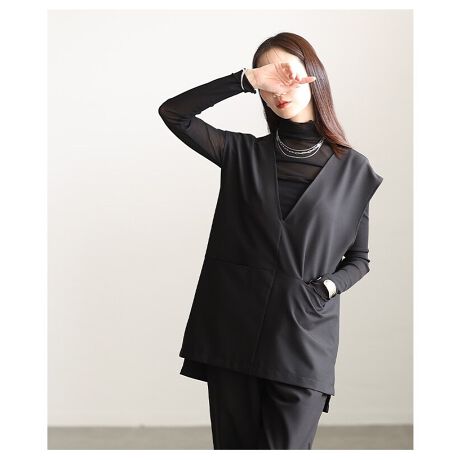 【トップス】 ベスト Vネック ノースリーブ テールヘム ポケット スリット レイヤード ブラック