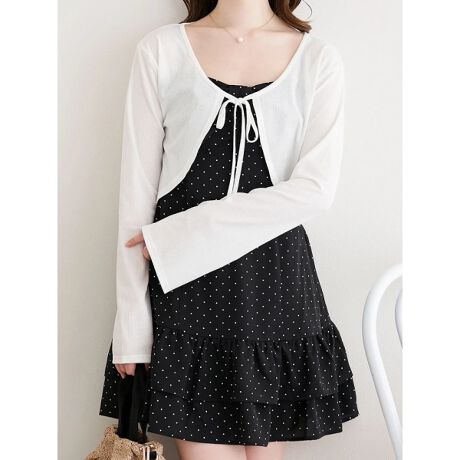 [型番:26560784505]リボンデザインのキャミソールとボレロがセットになったアンサンブル。配色の切り替えと裾のフリルが動きのあるシルエットをつくり、軽やかな印象で着られます。それぞれ単品でも使いやすく、着こなしの幅が広がるのも魅力。デニムを穿いて甘さを抑えたり、ミニボトムでバランスよくまとめるスタイリングもおすすめです。モデル(濃いグレー着用)身長:165cmMサイズ着用