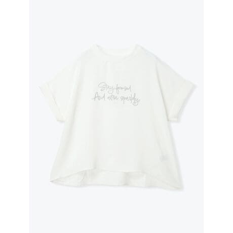 [型番:26550731308]表面にさりげない立体感のある素材を使用したロゴTシャツ。袖幅にゆとりがあり腕まわりをすっきり見せつつ、裾に向かって広がるシルエットで自然に体型をカバーしてくれるのもポイント。ナロースカートを穿いて縦のラインを意識したり、フレアスカートで軽やかにまとめる着こなしもおすすめです。