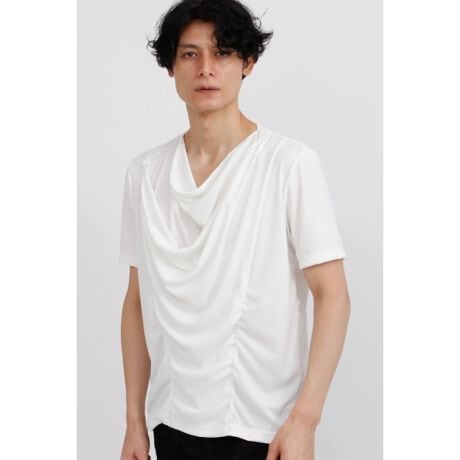 [DESIGN]<br. フロントを2重構造にしたドレープデザインに、シャーリングディテールを加えた、1枚でも高い存在感を放つ半袖カットソー。 流れるようなドレープが立体感と動きを生み、シンプルながらも印象的な表情に仕上げています。