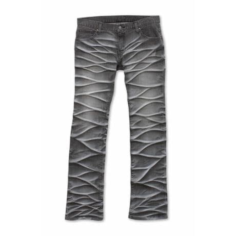デニム全体に立体の密度を計算し尽くし、その陰影を際立たせるために、上側と下側から異なる色目のコーティング剤を吹き付けるという、革新的なアプローチを採用。