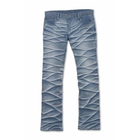 デニム全体に立体の密度を計算し尽くし、その陰影を際立たせるために、上側と下側から異なる色目のコーティング剤を吹き付けるという、革新的なアプローチを採用。