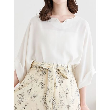 [型番:26580040816]ネックラインにあしらったパール調アクセントが上品に映えるドルマンブラウス。落ち感のあるなめらかな素材で動きに合わせてやわらかく揺れ、きちんと感のある印象に仕上がります。テーパードパンツを穿いてきれいめにまとめれば、通勤やオケージョンシーンにも活躍します。オンオフ問わず幅広いシーンで取り入れやすい1着です。モデル(オフホワイト着用)身長:160cmMサイズ着用