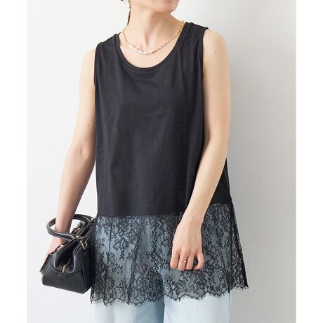 シンプルなタンクトップに、裾レースでさりげない華やかさを添えた一枚。